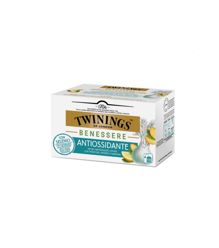 Lo sai che il selenio ha proprietà antiossidanti? Benessere Antiossidante è la miscela Twinings con selenio che contribuisce alla protezione delle cellule dallo stress ossidativo e favorisce il tuo benessere. Un infuso che combina il profumo vivace di limone , la delicatezza della radice di bardana e le note piccanti dello zenzero .