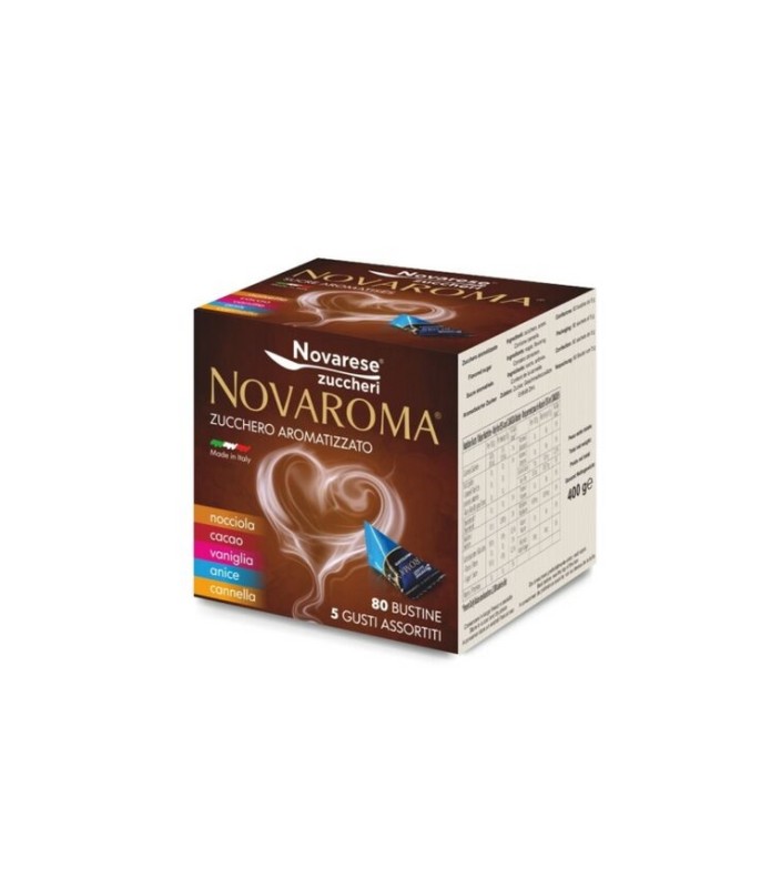 Lo zucchero aromatizzato Novaroma è confezionato in astuccio da 80 bustine a forma di tetraedro da 5g l’una, in 5 gusti misti assortiti.