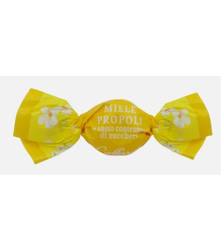 Caramelle dure con miele e propoli, a basso contenuto di zuccheri e a ridotto contenuto calorico.