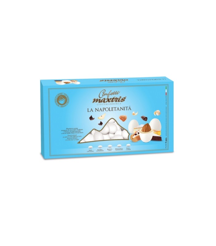 Mandorla tostata ricoperta da cioccolato fondente o bianco ai gusti assortiti (baba` con panna, pastiera napoletana, ricotta e pera, sfogliatella napoletana e torta caprese) e da un sottile strato di zucchero.