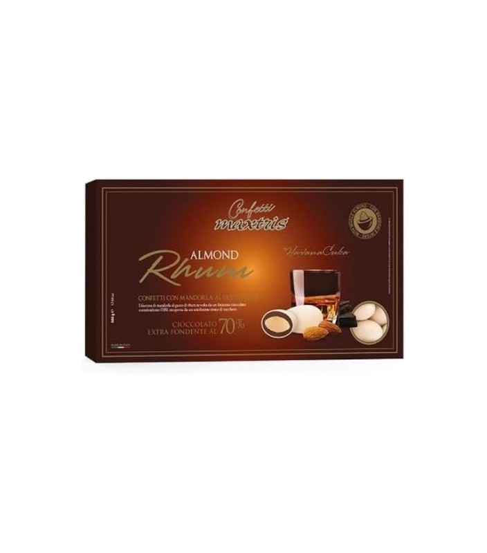 Confetti con cioccolato extra fondente (70%cacao) mandorla tostata, ripieni di liquore al Rhum.