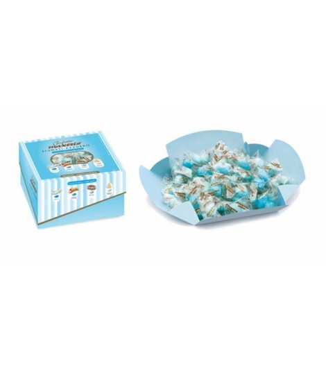 Mandorla tostata ricoperta da uno strato di cioccolato bianco ai gusti assortiti (cocco, cannolo siciliano, tiramisu` e delizia al limone) e da un sottile strato di zucchero.