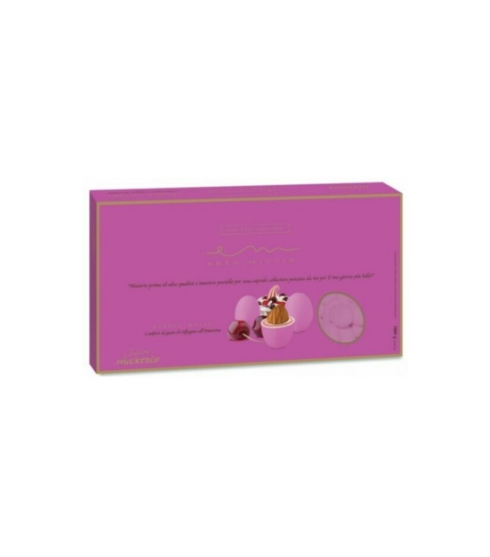Mandorla tostata ricoperta da cioccolato bianco al gusto di panna e amarena e da un sottile strato di zucchero.
