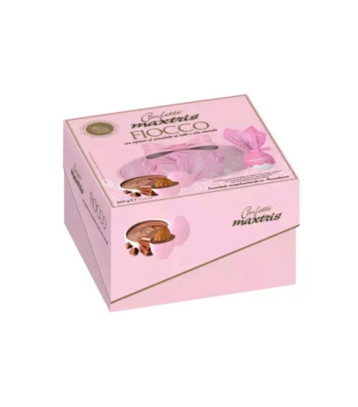 Vassoio Maxtris Fiocco Rosa: confetti con mandorla tostata ricoperta da cioccolato al latte e alle nocciole e da un sottile strato di zucchero