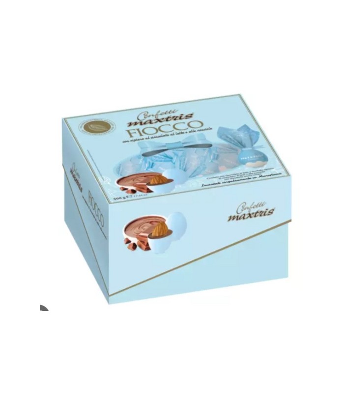 Vassoio Maxtris Fiocco Azzurro: confetti con mandorla tostata ricoperta da cioccolato al latte e alle nocciole e da un sottile strato di zucchero in busta da 500gr.