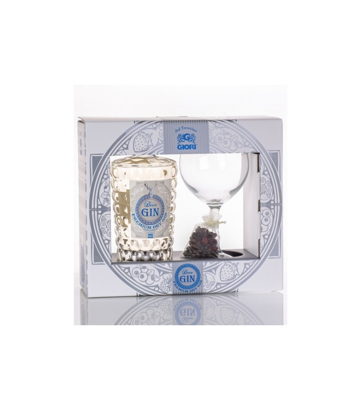 Prezioso astuccio serigrafato e personalizzato Deer Gin Giori completo di Bt. Deerr Gin, bicchiere per gin toni e botaniche disidratate di frutti di bosco, pepe nero e bacche di ginepro per decorazione drink.