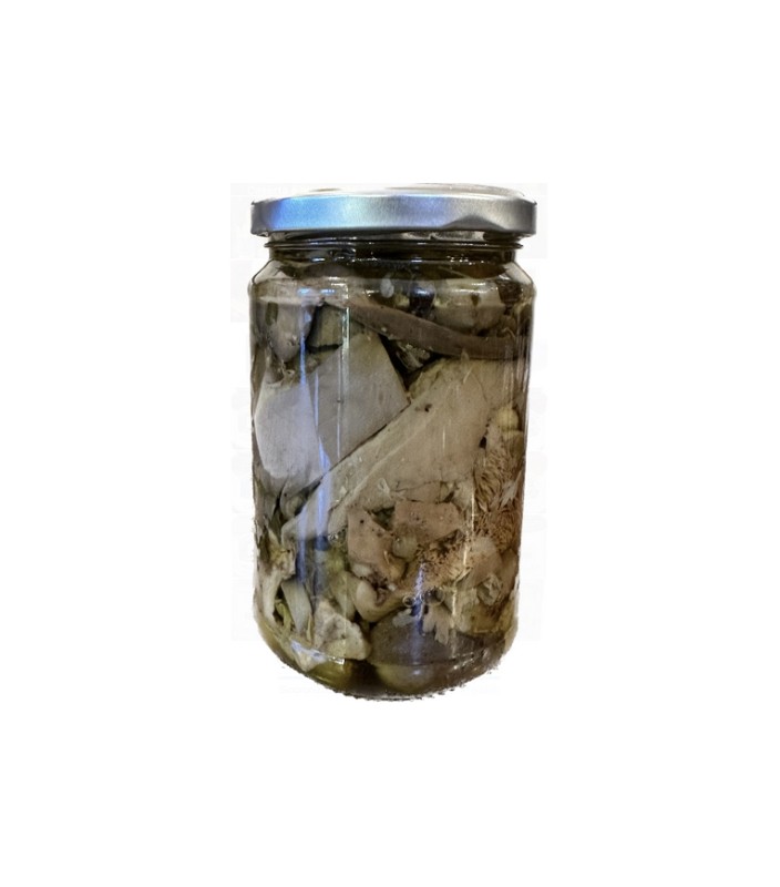 INGREDIENTI: Agaricus Bisporus sgambato (prataiolo), Boletus edulis Bull (porcino), Armillaria mellea (chiodini), Pleurotus (pennelle), Funghi Cardoncelli, olio extra vergine d'oliva 10%, olio di semi di girasole 10%, aceto, pepe, cipolla, aglio, sale, prezzemolo.