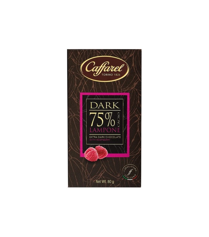 Tavoletta di cioccolato fondente Extra Dark con il 75% di cacao arricchito con lampone per una sorprendente armonia di gusto.